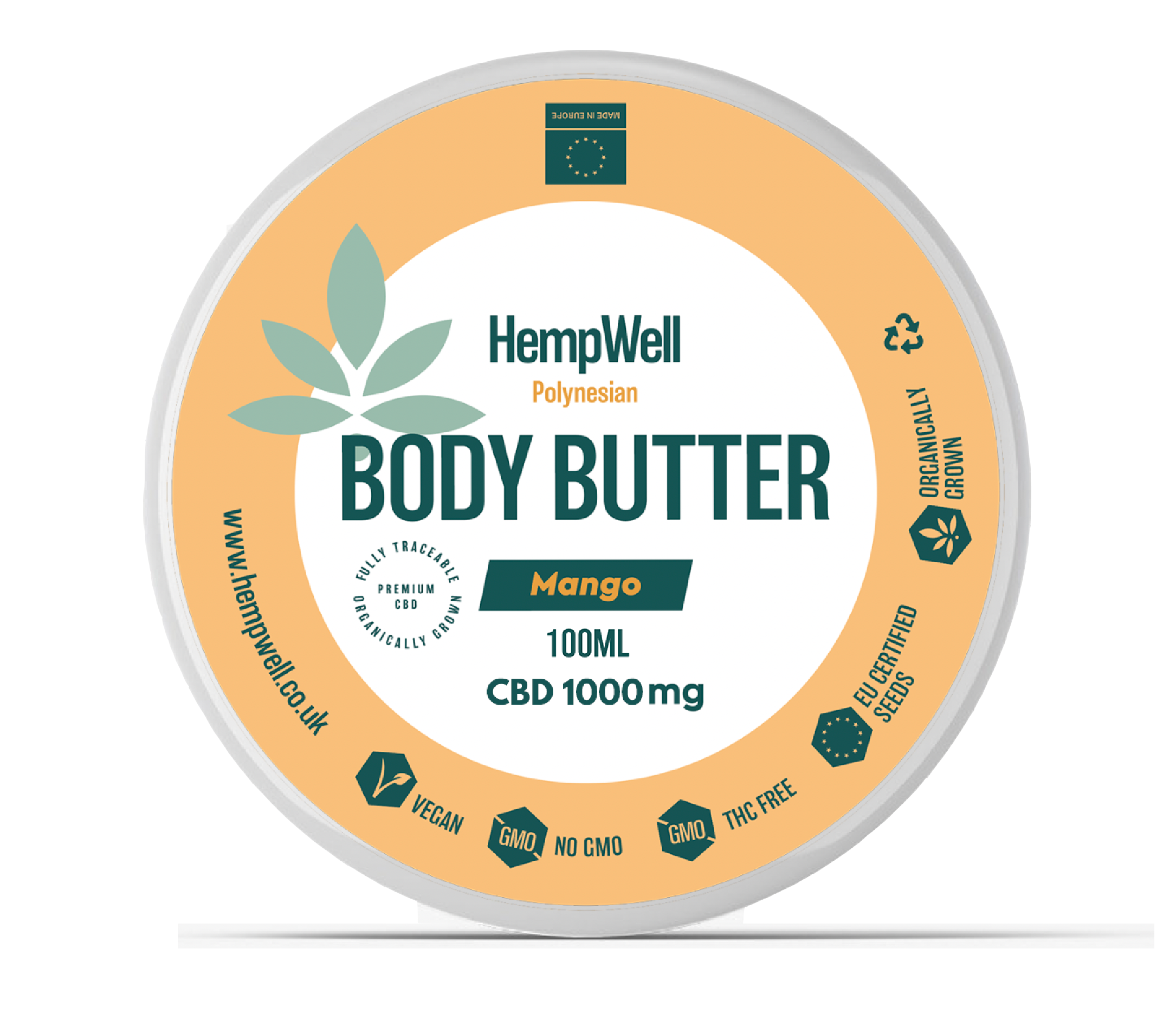 HempWell CBD Body Butter - Mango | 500mg CBD | 100ml Wonderfully creamy and great for CBD beginners and experts alike. Leaves your skin feeling refreshed and re-energised while protecting your skin.